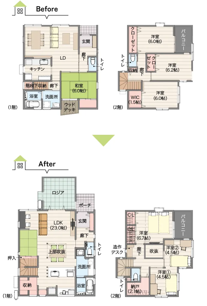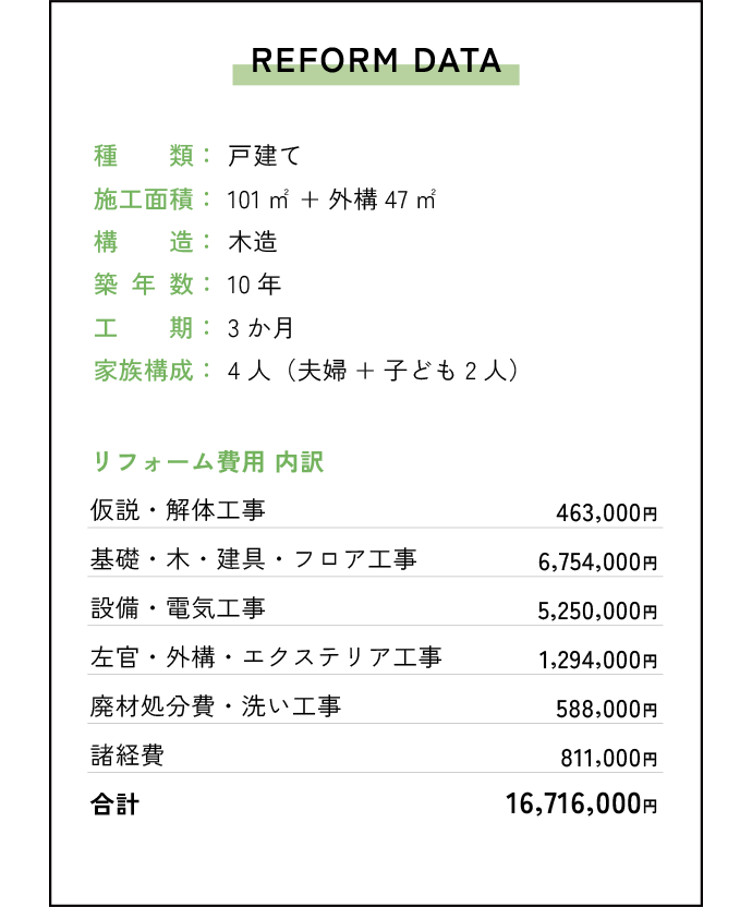 家のセンターに吹き抜けを造り、どこにいても家族の空気が感じられるようにしました。和室をつなげ広々としたLDKに間取り変更。ガラスブロックを使ったロジアを新設し、お子様が伸び伸びと遊べる空間になりました。
