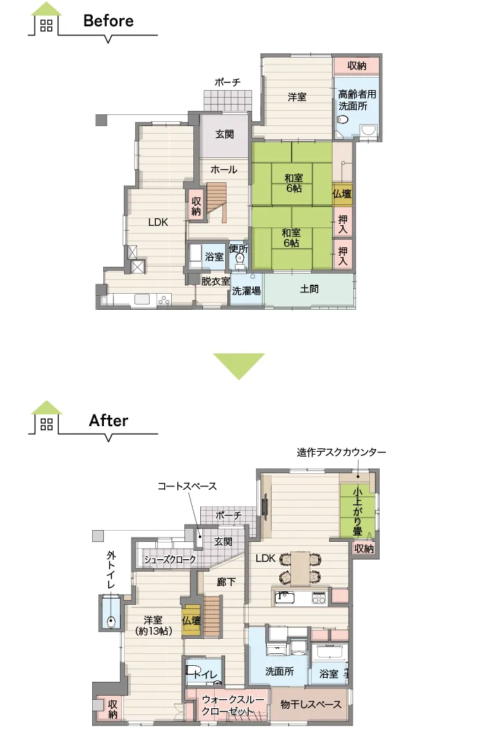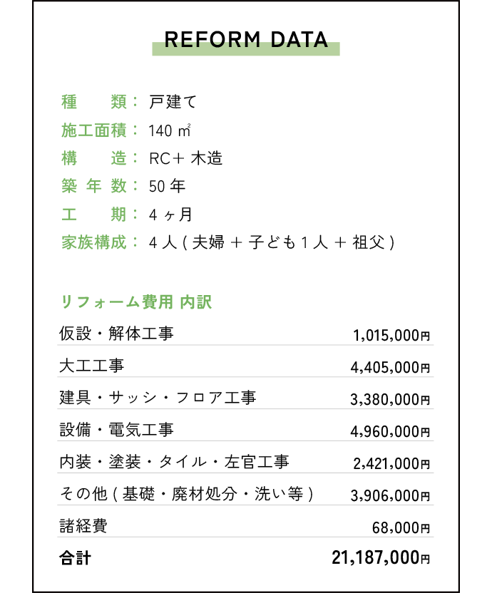 水まわりの動線をまとめたことで子育てがしやすくなり、家事負担が軽減しました。家族の集まるLDKは、一番明るく広い場所へ間取りを変更。多目的な畳スペースの設置で2世帯でくつろげるようになりました。