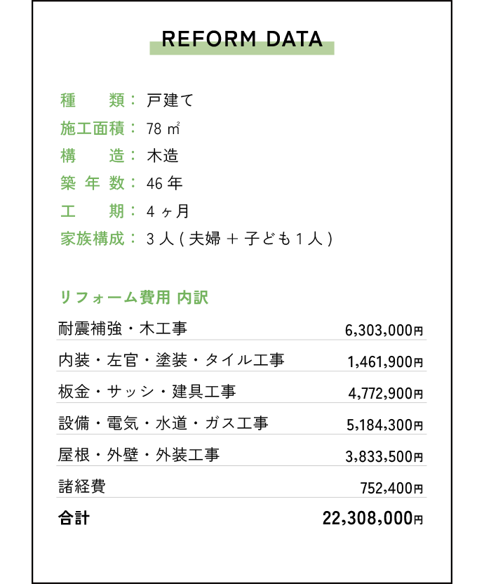 お子様が生まれたことをきっかけに、ご実家の敷地にある離れをフルリフォーム。祖父の代から受け継いだ自慢の庭が楽しめるお家をご希望されました。