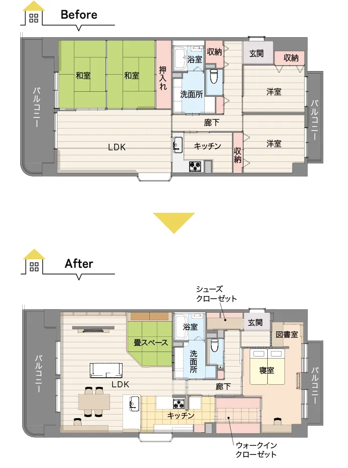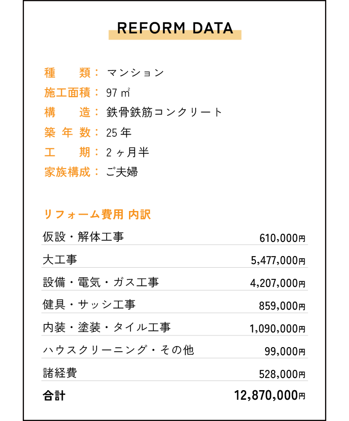中古物件で買ったマンションのため、機能していない部屋や、家が物であふれてキッチンがリビングと分離して孤立しているのが不便とのことでした。