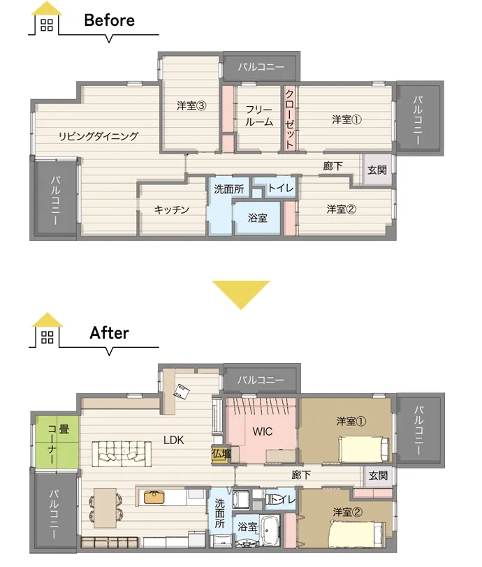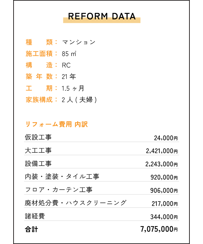 いろいろな部分の劣化が気になるのと、ご夫婦2人暮らしのため、もっと使い勝手の良い間取りや大きなイメージチェンジに憧れ、ご依頼をいただきました。