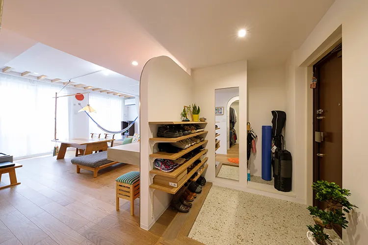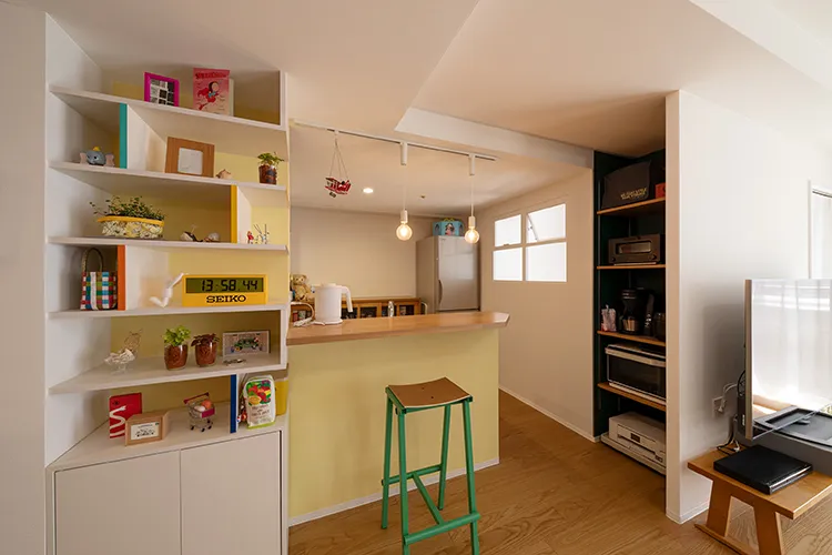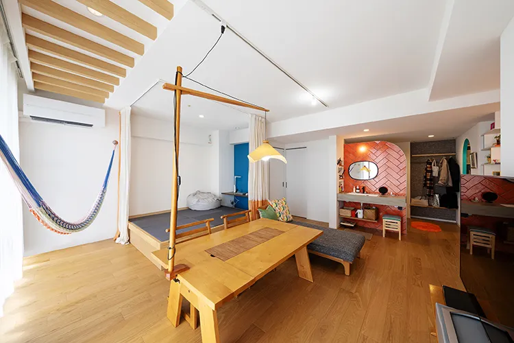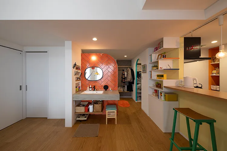 お母様から相続したマンションを、大好きな色に囲まれた遊び心あふれる空間へとリフォームしました。玄関・WIC・LDKがゆるやかにつながる間取りにより、家の奥まで光が届き、日差しや風を感じながらくつろげるリラックス空間が完成しました。