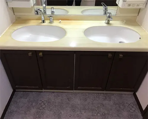 2つの洗面ボウルと壁いっぱいの収納を備えた洗面から、ウォールナットのカウンターと白の洗面ボウルが際立つ、シンプルでシックな洗面になりました。シンプルな空間に生まれた余白が厳選されたアイテムを一つ一つ引き立て、「ゆとり」ある暮らしを叶えてくれます。