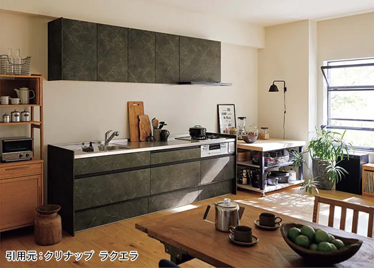 クリナップの「ラクエラ」は、インテリアに溶け込みやすいデザインを意識して作られたキッチンシリーズです。扉のカラーバリエーションや質感が豊富で、リビングの家具とコーディネートすることで、おしゃれな空間づくりが可能になります。