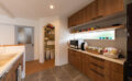 独立タイプのキッチンの奥の扉を開くと、小部屋型のパントリーに。その隣にはランドリールームへつながる扉があり、料理をしながら洗濯も同時進行しやすい家事動線です。パントリー内には棚板を設置して、食料品だけでなく収納場所に困りがちな書類などもしまえるようになっています。床材は暗めの石調タイルで、高級感のある雰囲気です。