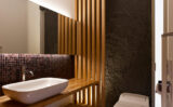 3方向の手すりで安全!ブラック基調のおしゃれな浴室