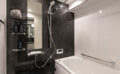 ラグジュアリーな浴室、ダークグレーで落ち着いた印象に。二重窓で寒さ対策もバッチリ