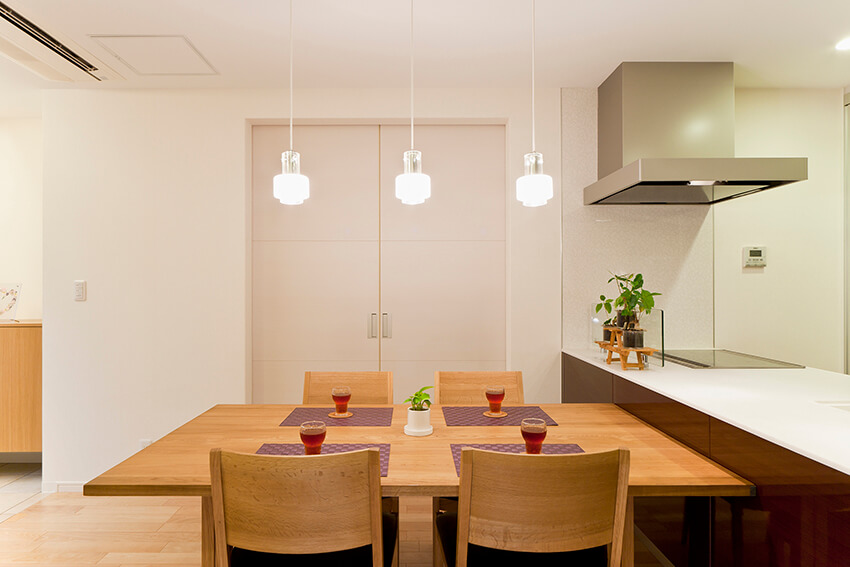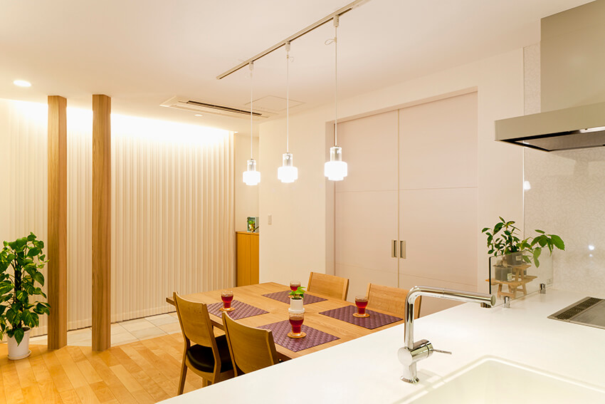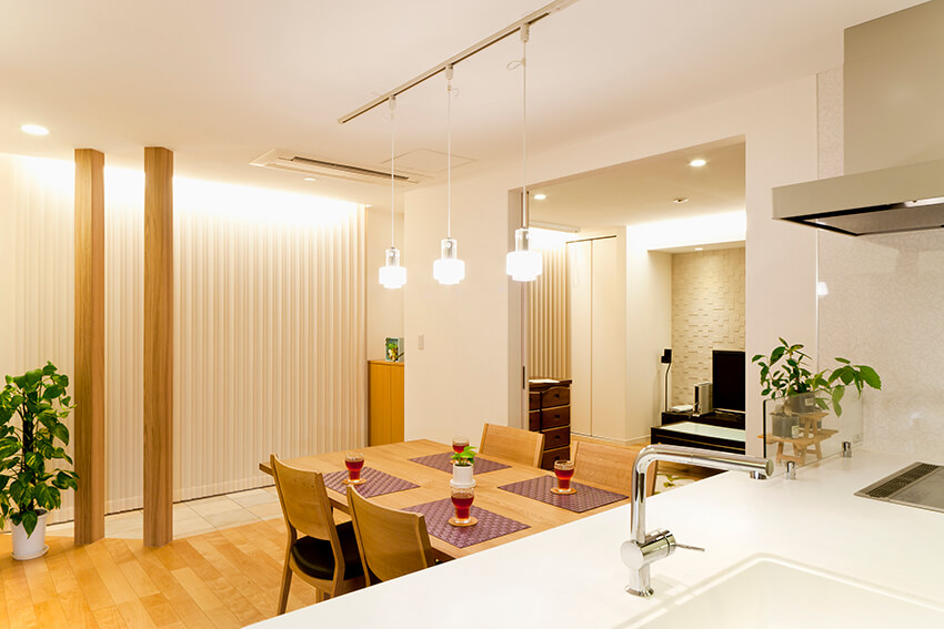 光と石の質感に包まれ家族とくつろぐ、開放的なリビング