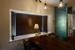 キッチンとダイニングの間にある壁にあしらったタイルは、刷毛で手塗したようなワイルドな色ムラと貫入のヒビ割れ感が印象的。レトロな雰囲気を持ちつつもモダンなタイルが生活感が出がちなキッチンをファッショナブルに彩ります。