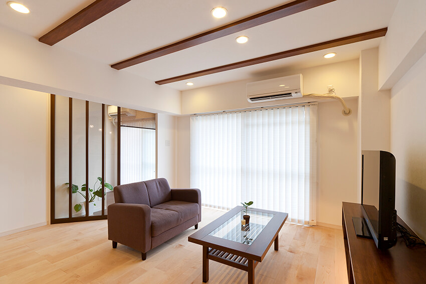 付梁×ガラス間仕切りで魅せる、開放感あふれるリビング