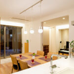光と石の質感に包まれ家族とくつろぐ、開放的なリビング