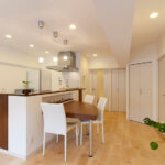 家族が自然と集まる、造り付けテーブル付きおしゃれキッチン